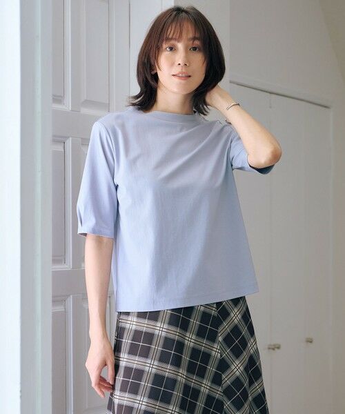 ■デザイン暑い時期にはさらりと1枚で、涼しい時期にはインナーとしても頼れるコンパクトなモックネックカットソー。襟元はやや広めに開いたモックネックで、Tシャツ感覚で着られながらも、大人らしい上品な1着です。程よいサイズ感はジャケットやカーディガンのインにもおすすめです。合わせるアイテム次第で、ロングシーズン活躍してくれる優秀トップスです。カラーは、シックで大人な印象のスレート (#004)、シーンレスに活躍するブラック(#005)、柔らかく女性らしいライトベージュ(#033)、爽やかで凛とした印象のサックス(#073)の4色展開。