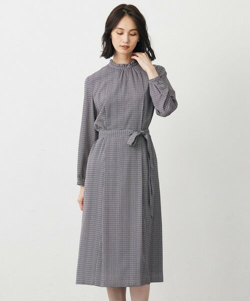 ■デザインスタンドカラーとフリルが上品なワンピース。フィット&フレアーのシルエットがすっきりとした印象で、膝が隠れるミディ丈で品よく仕上げました。布帛のリボンでウエストマークもでき、メリハリのある着こなしが叶います。身頃のみ裏地付きで、着心地にも配慮しています。カラーは、クラシックで温かみのあるブラウン(#330)、トラッドな大人の上品さがあるネイビー(#375)の2色展開です。