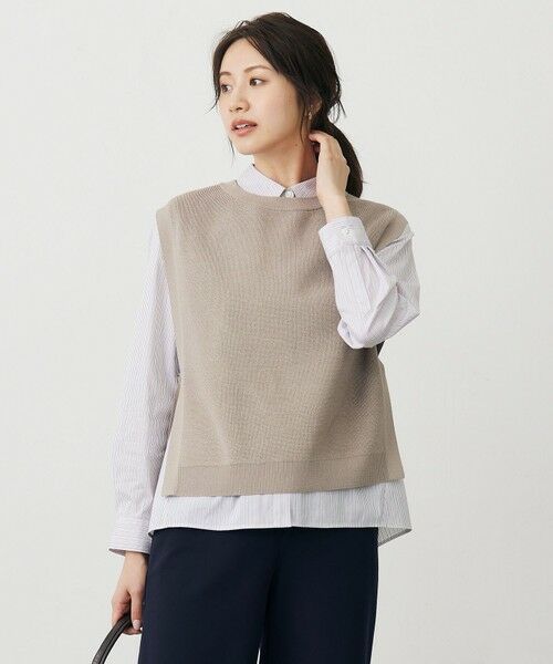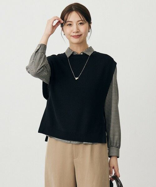 ■デザインスタイリングのポイントになる、片畦編みのベスト。程よい厚みと軽さで、ボディラインを拾い過ぎず、さりげなくカバーしてくれます。両サイドが開いたすっきりとしたデザインで、ベルト仕様を採用。シャツやカットソーの上に重ねるだけで、いつものコーディネートに新鮮さをプラスできます。レイヤードスタイルを楽しみたい季節に重宝する、1枚持っていると便利なアイテムです。※両サイドについたベルトのWカンは奥まで締めてしまうと紐が抜けやすくなります。奥まで締めず遊びを持たせていただくと紐が抜けにくくなります。