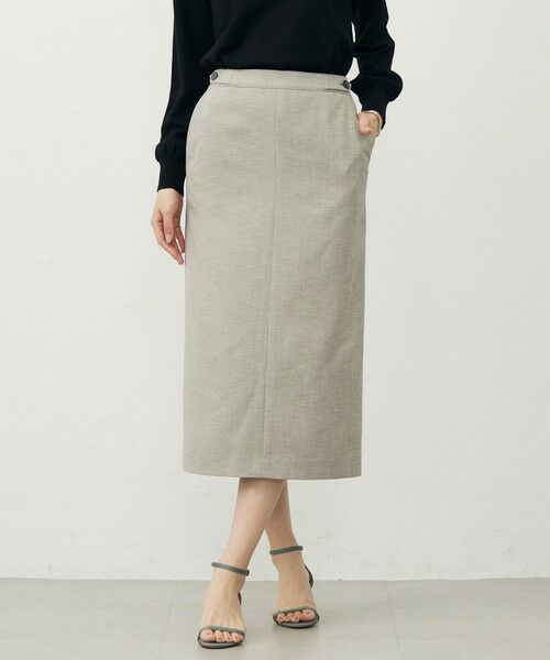 ■デザイン程よく身体のラインから離れたIラインシルエットのスカート。少しだけ裾に向かってゆとりを入れ、スタイリングが品よく着こなせる絶妙なバランスに仕上げました。後ろにスリットを入れているので脚さばきもよく、軽やかさのある穿き心地です。前ウエストにはタブディテールを効かせ、さりげないアクセントに。後ろウエストはゴム仕様で、きちんと感がありながらラクな穿き心地も叶えました。総裏ありです。