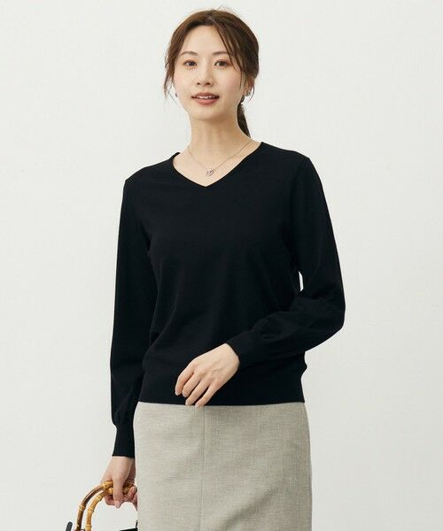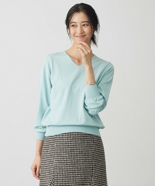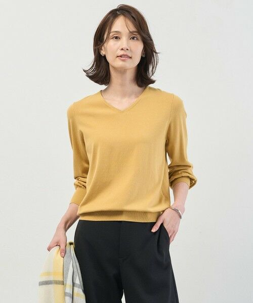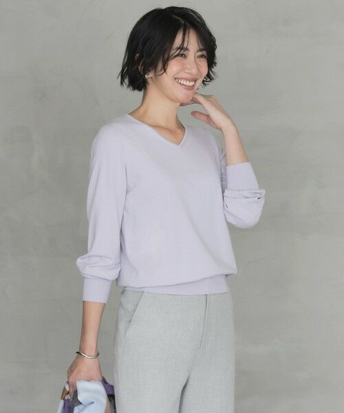 ■デザイン顔周りをすっきり見せる、人気の定番Vネックニット。開きすぎない上品なネックラインは、パイピングで繊細に仕立て、きちんと感と女性らしさのある表情に。インナーを選ばず1枚でもサマになるバランスで、年代やシーンを問わず活躍する、長く愛せるベーシックアイテムです。カラーは、上品で落ち着きのあるグレージュ(#003)、シックで引き締まった印象のブラック(#005)、華やかで女性らしいピンク(#012)、肌なじみの良いナチュラルなトップベージュ(#033)、明るく気分を上げてくれるイエロー(#040)、清潔感のあるさわやかなブルー(#074)、軽やかでフレッシュな印象のミント(#062)、優雅で上品なニュアンスカラーのラベンダー(#083)、優しくフェミニンなピンク1(#112)の9色の展開です。