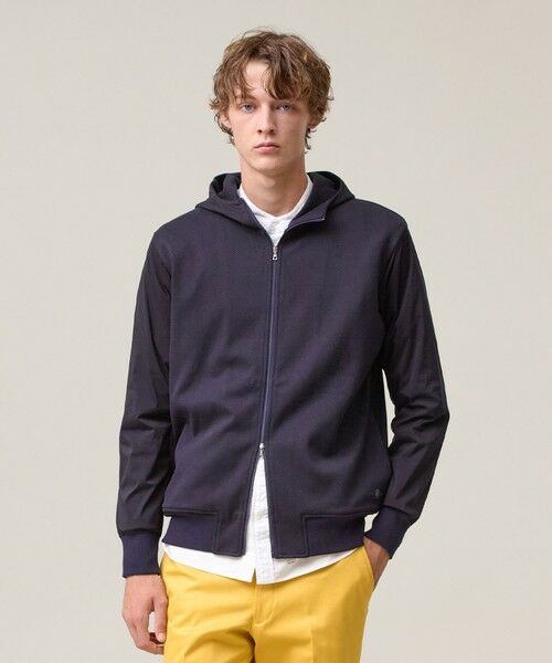 ■仕様袖・フードに使用した布帛ナイロンが軽快な印象を演出しています。身頃はリンクス編みのヘリンボン風組織でブランドらしさをプラス。