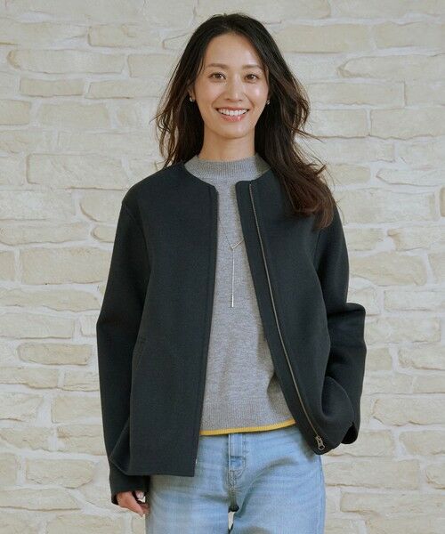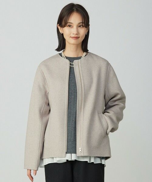 ■デザイン軽やかで使いやすいショート丈のノーカラーコート。ややコンパクトな肩回りとすっきりとしたボクシーシルエットに仕上げました。前開きファスナー仕様で、さっと羽織れて気軽に着られるもの嬉しいポイント。首元がすっきりとしたノーカラーデザインは、タートルネックなどのレイヤードにも映え、秋冬の着こなしをぐっと引き立ててくれます。リバー縫製ならではの上品な仕立てに加え、裏地をつけることでロングシーズン着られる仕様に。大人のスタイリングに取り入れやすいモダンで洗練された印象の1着です。背裏、袖裏あり。カラーは、柔らかな雰囲気のライトグレー(#003)、肌なじみが良いベージュ(#033)、洗練された大人の印象を与えるミッドナイト(#074)の3色展開です。