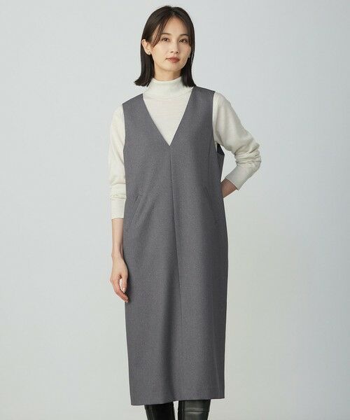 ■デザインシンプルでありながら、切り替えデザインがアクセントのジャンパースカート。ストンとしたシルエットで体型も程よくカバーでき、Vネックデザインが首周りをすっきりと見せます。デザイン性と素材感があるアイテムですが、きれいめにもデイリーにも使える汎用性の高さも魅力。サイドには便利なポケット付きです。気温に合わせてインナーを調整できるので、肌寒い時期から暖かい時期まで活躍してくれます。カラーは、落ち着きのあるグレー(#004)、季節感を盛り上げるベージュ(#033)、シーンレスに活躍するネイビー(#075)の3色展開です。