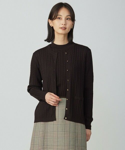 ■デザインいつの時代も愛されるトラッドスタイルを、今季らしくアレンジしたミニケーブル柄のクルーネックカーディガン。昨年よりも肉感をやや厚くアップデートし、ケーブル柄の立体感が上品で温かみのある表情を作りました。ゴールドのブランドロゴ釦がさりげないアクセントとなり、コーディネートに特別感をプラスしてくれます。羽織りとしてはもちろん、ボタンを閉めればトップスとしてもお使いいただける汎用性の高いアイテムです。同素材のクルーネックニットとツイン風に合わせるのもおすすめ。カラーは、スタイリングのアクセントになるオレンジ(#020)、肌なじみの良いベージュ(#033)、こなれた印象のダークブラウン(#035)、洗練された印象のエメラルド(#064)、オンオフ兼用できるネイビー(#075)の5色展開です。