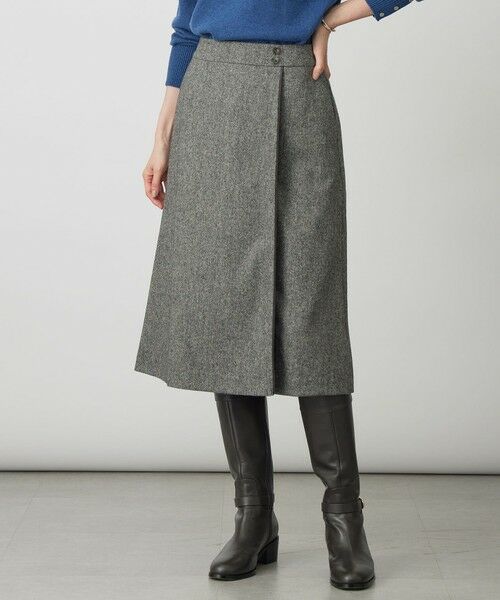 ■デザインラップ風の切り替えがポイントのひざ下丈のAラインスカート。すっきりとしたウエストラインの、ダブルボタンとモールパイピングがデザインポイント。シルエットは合わせるトップスを選ばないベーシックなAラインです。着丈も長すぎず短すぎずの絶妙なバランスで、ジャケットやニットとの相性も良く、秋冬の着こなしに頼れる1着です。生地表面には、控えめなきらめきのラメ糸を織り込み、光の加減でほんのりとした華やかさが漂うデザインに。見た目に反して軽やかな着心地で、気温が下がりきらない時期から季節感を先取りできる、アイテムに仕上げました。