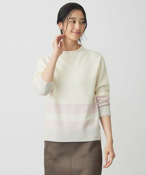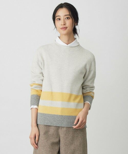 ■デザイン柔らかい色合いで切り替えた、スタイリングのアクセントになるブロッキングニット。部分的にラメ糸を織り込み、繊細な輝きをプラスし、上品な華やかさにこだわりました。柔らかい印象のカラーブロックなので、春先まで着用していただけます。カジュアルにもきれいめにも馴染む、ロングシーズン活躍するアイテムです。カラーは、女性らしさをプラスするピンク(#112)、スタイリングに華やかさを与えるイエロー(#140)、爽やかで大人っぽいサックス(#173)、洗練された印象のライトグレー(#191)の4色展開です。