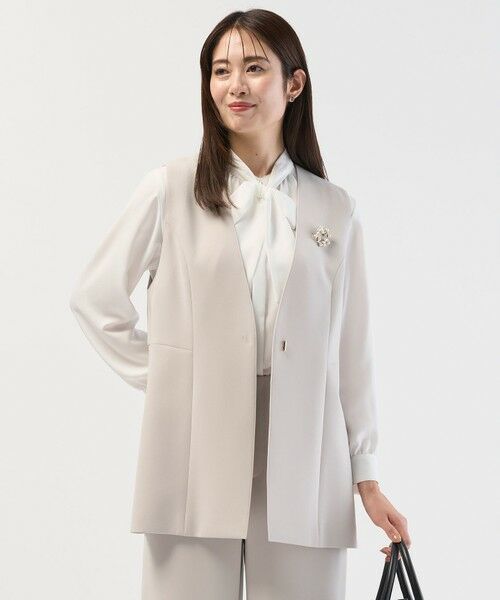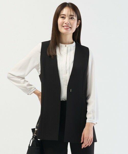 ■デザイン上品な雰囲気に仕上げた、トレンド感のあるジレ。ペプラムシルエットで女性らしさを演出し、気になる腰まわりをカバーしてくれます。シャープな印象のVネックで着回しやすく、カギホックで開閉できる仕様にしています。ボウタイ風ブラウスやカットソーを合わせて、同素材のパンツとのセットアップコーデがおすすめです。気温に合わせてインナーを変えることでロングシーズン活躍し、ワードローブに1枚あると重宝するアイテムです。背抜き仕様です。