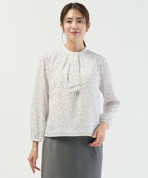 ■デザイン2way仕様の、ボウタイを内側にしまうと台襟プルオーバーとしても着られるカットソー。さりげない華やかさをプラスしてくれる、襟元のタックがポイント。センターフロントのタック奥に開きをつくり、プルオーバーでありながら着脱しやすい仕様にしました。身頃はカットソーとジャージの2重仕立てで、透けを気にせず安心して着用できます。袖は1枚仕立てになっているので、ジャケットインにもすっきりと収まります。襟元の釦にはシルバーメタルをあしらい、ボウタイをしまっても華やかさのあるデザインにしました。通勤からお出かけまで活躍する、スタイリングのポイントになるアイテムです。