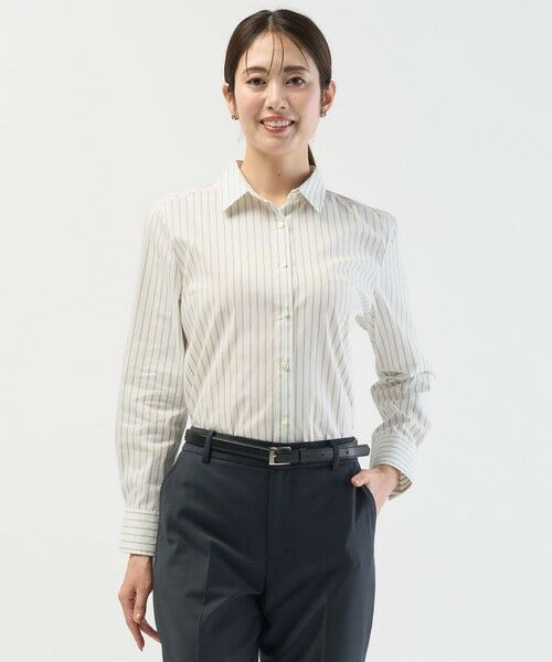 定番のシャツカラーブラウス。程よくゆとりのあるシルエットで、レイヤードのインナーとしても着用できます。合わせるアイテムによって、カジュアルからフォーマルな通勤スタイルまで幅広いシーンにマッチします。カラーは、清潔感ときれいめな印象を与えるホワイトドビー(#001)、女性らしさと上品さを兼ね備えたホワイト×ピンク×ネイビー(#112)、洗練された雰囲気のホワイト×ライム×グレー(#140)、爽やかで知的な印象のサックス×ホワイト×ベージュ(#173)の4色展開です。