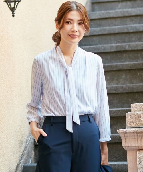 フロントインのこなれ感が簡単に!こだわり詰まった上品ブラウス■デザインオリジナルプリントを施したブラウスです。シンプルながらもステッチラインを入れ、上品なポイントにしました。後ろ衿をスタンドにすることにより、取り外し可能なボウタイを外した時のアクセントになるようなデザインです。裾の内側に釦がついているので、前だけインしたフロントインのスタイリングが簡単に作れます。■素材プリントストライプの生地は落ち感とドレープ性のある軽めの素材です。ポリエステル100%素材なので、シワになりにくく、着心地よく仕上げました。※商品画像はサンプルを使用しているため、色味やサイズ等の仕様に変更がある場合がございますので、予めご了承ください。