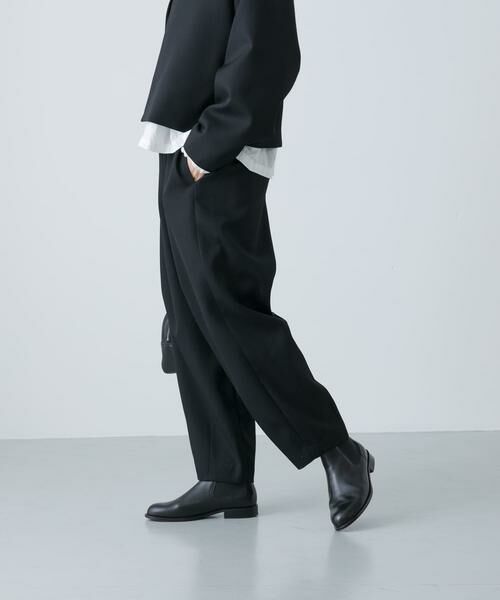 あらゆるシーンに寄り添うきれい目なボトムが届きました。ほんのり丸みのあるコクーンデザインが女性らしく優しげな印象。フロントのタックが奥行きを生み、落ち感のある素材と相まってどこかスッキリとしています。裾に向かった程よくテーパードがかかっているので、トップスとのバランスが取りやすいです。生地はスーツなどに使われるクリアな表面のウール100%素材。ウエストはゴムで楽な着心地なのに、抜け感のあるシルエットがぐっとお洒落な雰囲気に。