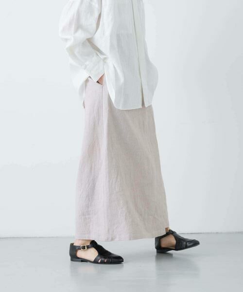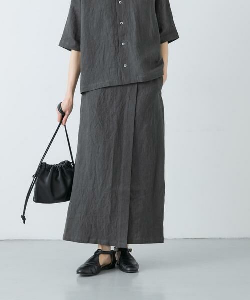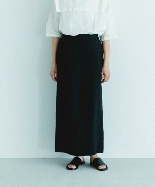 ストレートのラインが大人っぽいデザイン。ラップ部分は2重になっていて内側も脇でしっかりと縫われているので、脚が見えてしまうことはありません◎足さばきが楽にできるほんのりとした台形のシルエットは見た目以上に歩きやすいです。ウエスト後ろはゴムが入っていてやや余裕のあるデザイン。おなかまわりを上手にカバーし、スタイルを良く見せてくれる優秀なアイテム。遠州染めならではの色味が存在感のある装いを後押し。強風と日光を浴びた独特なムラや細かなしぼが特徴。