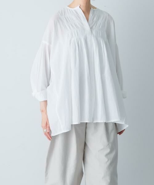 インドならではの手仕事を感じる1枚。細かなピンタックの技巧が施されたブラウスです。袖はカフス仕様を採用し、きちんとした雰囲気をプラス。オンオフ問わず日々のスタイリングに活躍します。ゆったりとしたサイズ感と、ヒップまわりを優しくカバーする丈も嬉しいポイント。薄手で軽やかなのでロングシーズン着まわしに重宝。前開きのデザインはさっと羽織るのにも便利です。
