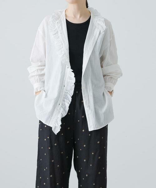 襟ぐり~前立て・袖口に共布のフリルをたっぷりとあしらった存在感のあるブラウス。顔まわりを華やかに演出します。カーブした裾も抜けた雰囲気を後押し。生地はワッシャー感があり、ノーアイロン・洗いざらしで着られる風合いです。デニムなどのカジュアルなパンツを合わせるスタイリングがおすすめ。ジャケットを羽織って、中からのぞかせる着こなしも素敵ですよ。