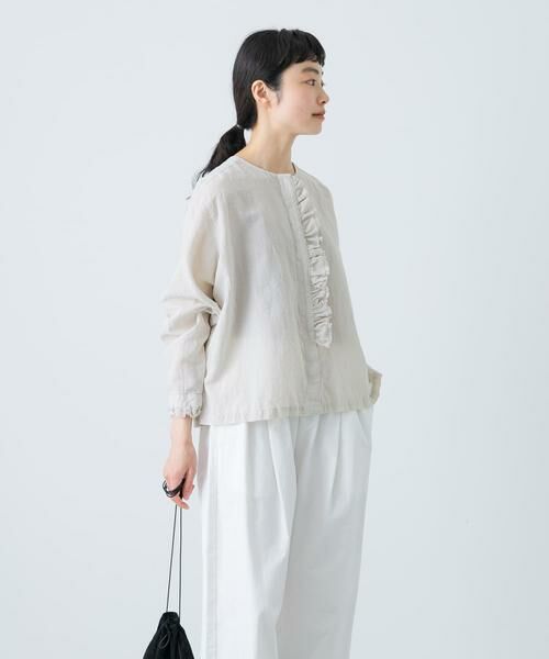 大人の装いに程よい華やぎを添える一品が届きました。洗い加工を施したくったりとした質感とディテールのバランスが絶妙で、ほんのりとした甘さに仕上がっています。生地は風合い豊かなコットンリネン素材を使用。フリルは前立ての片方だけなので取り入れやすく袖口にもさり気なく配置。端は断ち切り始末にしてラフなムードをまとわせました。ベストやサロペットなどのインナーにも便利なアイテム。