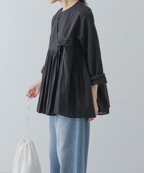 インドの伝統的なディテールを取り入れたこだわりのブラウス。フロントが重なるカシュクール仕様です。胸下から細かいタックギャザーが施され1枚で雰囲気のある装いに。民族感が強くなりすぎないよう着やすいデザインに再構築しました。前を閉めるとクルーネックに、ボタンを開けるとVネックのようにも着用可能。カジュアルなパンツやストレートシルエットのスカートを合わせてお楽しみください。羽織りとして使ったり、上からカーディガンを合わせたスタイリングも素敵ですよ。