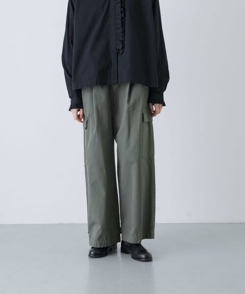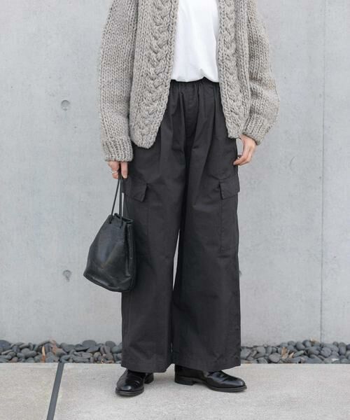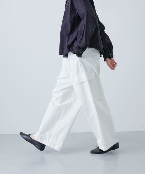 “2WAY”でシルエットを楽しめるイージーボトム。両サイドのポケットがポイントのカーゴデザインです。フロントに入ったタックが立体感を生み、ワイドながらも着まわし力の高いストレートシルエット。カットソーやシャツと合わせるだけで着こなしが決まります。甘めのトップスともバランスが取りやすく好相性。OFFは透け防止加工が施されているので安心感があります。