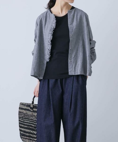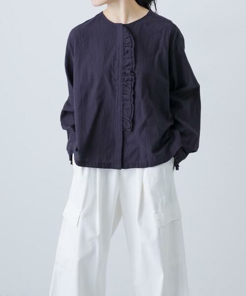 大人の装いに程よい華やぎを添えるトップスが届きました。風合い豊かな生地の質感とフリルが絶妙なバランスを生み、さり気ない甘さが表現されています。フリルは前立ての片方だけなので取り入れやすく袖口にもさり気なく配置。端は断ち切り始末にしてラフなムードをまとわせました。1枚で着映える優秀なアイテム。コットン高混率素材なので長く着まわしをお楽しみください。