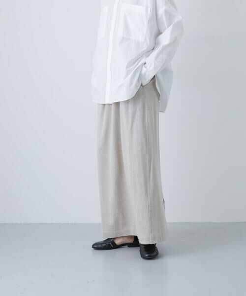 程よくゆとりがあるのにスッキリと見える穏やかなIラインシルエット。快適な着心地を叶えるカットソー素材でご用意しました。裏側にコットンが多くなるように編立られているので肌当たりの良さもポイント。表側はリネンがメインに出ていて上品で涼し気な風合いです。お出かけから日常まで様々なシーンで活躍。天竺素材ならではの優しい伸縮性とベンツ仕様により足さばきが良いです。ウエストは楽に穿ける総ゴム+紐の仕様を採用しています。お手持ちのトップスと、様々なスタイリングをお楽しみください。同素材でイージーパンツもご用意しています。