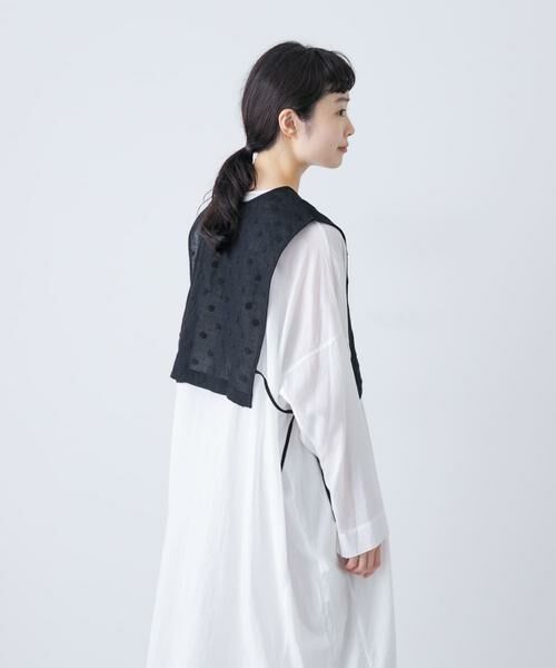 コーディネートに変化を与え、いつものアイテムに華やかさをもたらす一品。簡単に大人のレイヤードスタイルを叶えるベストです。コンパクトでバランスが取りやすく様々なスタイリングをお楽しみいただけます。ウールガーゼに立体的なドット刺繍を施したこだわりの素材。同系色の糸を使用しているので派手になりすぎず馴染みやすいです。洗練されたムードとナチュラルな佇まいが絶妙なバランス。脇が開いていて紐で結ぶ仕様なので合わせるものによって調節が可能です。カットソーからシャツ・ブラウスまで、コーディネートのアクセントに重宝します。