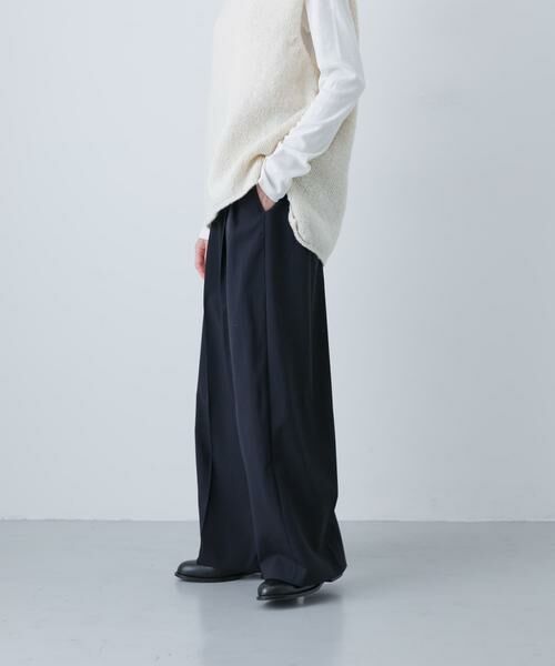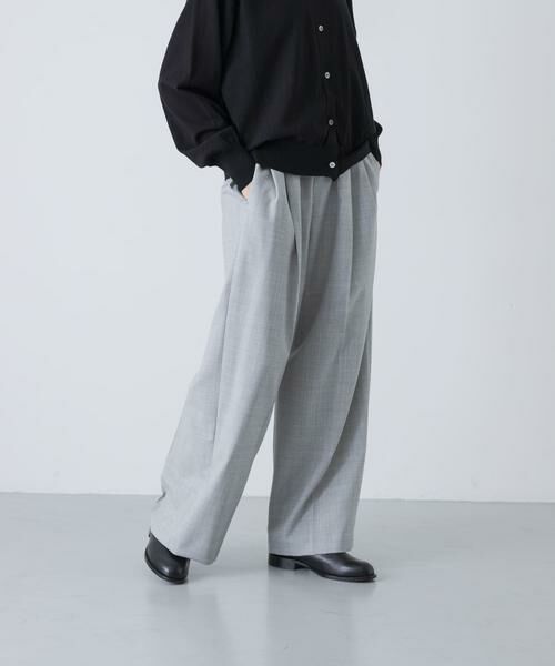 大人の上品スタイルを叶えるイージーパンツ。フロントに施された2タックがシルエットを美しく見せてくれます。センタープレスも下半身をすっきりとした印象に。クリアな風合いのウォッシャブルウールを使用。上品な雰囲気ながらもウエストはゴム+紐の仕様なので楽な着心地。ブラウスやニットはもちろん、スウェットやスニーカーなどでカジュアルダウンしたスタイリングも素敵です。オンオフ問わず様々なシーンに重宝するおすすめアイテム。
