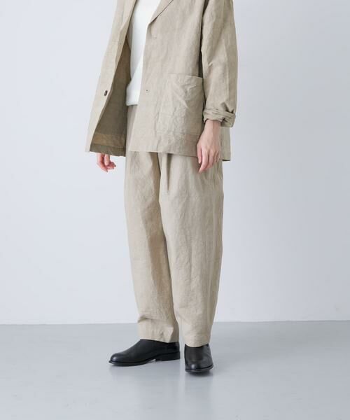 素材とパターンにこだわったイージーパンツは、ほんのりと丸みのあるシルエットがポイント。季節を問わないアイテムなのでロングシーズン活躍の予感です。ウエストのタックが程よい立体感をもたらし、ヒップやもも周りに余裕がありながらも、裾のダーツがどこかすっきりとしたシルエット生み出しています。遠州染めならではの色味と質感がこなれた雰囲気を実現。強風と日光を浴びた独特なムラや細かなしぼが特徴です。カットソー・ブラウス・ニットまであらゆるトップスに寄り添い着まわし力の高い一品。総ゴム+紐付きの楽な着心地も嬉しいポイント。両脇/ヒップにはポケット付き。同素材のジャケットとセットアップもおすすめです。
