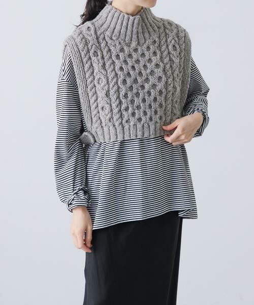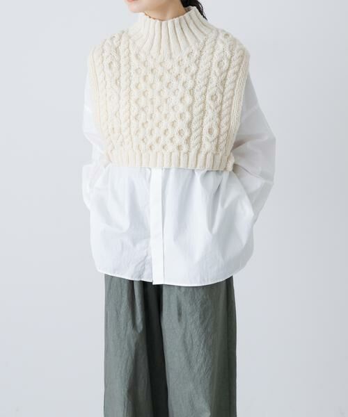 程よく立体的な編み柄が着こなしに奥行きを与えるアイテム。優しく首元に沿うタートルネックがポイントです。脇が開いていてボタンで留める仕様なので、ワイドシルエットのトップスも合わせられます。カットソーやシャツ・ブラウスはもちろんワンピースの上にレイヤードするスタイリングもおすすめ。上からコートも羽織りやすいので秋から冬にかけて長く活躍。シリーズで他のアイテムもご用意しているのでぜひご覧ください。
