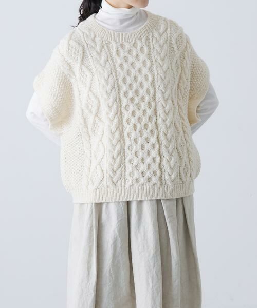 手編みの優しい雰囲気と無染色の色合いが魅力的なアイテム。ボリュームは出すぎずからだに馴染み、大きくは見えないのがポイント。見た目よりも軽いので気軽に手に取っていただけるおすすめのベストです。首元は開きすぎず上品な印象に仕上げ、肩まわりを穏やかにカバーするデザインにも注目。スカートやパンツはもちろん、ワンピースの上にレイヤードするスタイリングも素敵ですよ。シリーズで他の商品もご用意しているのでぜひご覧ください。