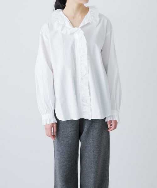 襟ぐり~前立て・袖口に共布のフリルをたっぷりとあしらった存在感のあるブラウス。裾は穏やかにカーブしていて抜けた雰囲気があります。カジュアルなパンツを合わせてスタイリングをお楽しみください。着こなしのメインとしてはもちろん、ニットやジャケットの中からのぞかせるのも程よい華やかさがプラスされおすすめです。