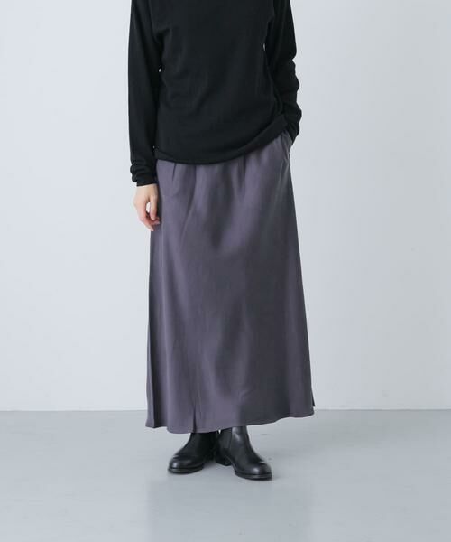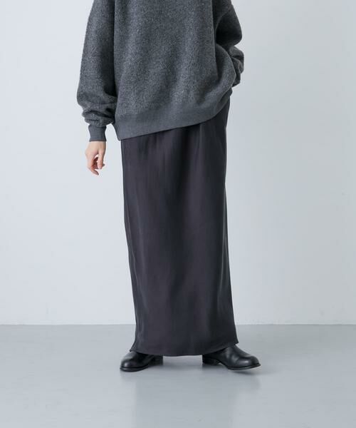 下半身を綺麗に見せてくれる優秀な一品。丈違いの2サイズご用意しました。細身に見えますが、バイヤス(生地を斜めに裁断)で仕立てているため、着用すると横方向へ伸びがあります。からだに合わせてゆとりが生まれ、体型を拾いにくいデザインです。伸縮性がありスリット無しで足さばきが良いのもポイント。大人の装いを上品に昇華します。ウエストはイージー仕様を採用。ニットやスウェットなど、少しボリュームのあるトップスと好相性です。