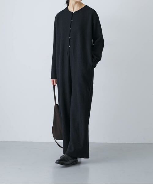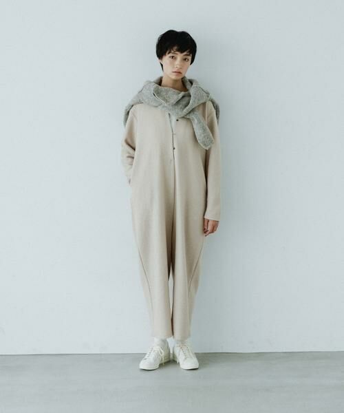 ブークレーならではの表面感のある素材でオールインワンをご用意しました。カットソー生地なので窮屈にならず、ゆったりしたストレートシルエットと相まって着心地の良さも嬉しいポイント。縮絨加工を施した温かみのある風合いが魅力的です。華奢なフロントボタンがさり気なく、シンプルながらもどこか上品な表情。カジュアルにはもちろん、ジャケットやブーツと合わせて大人の余裕を感じるスタイリングもおすすめ。インナーにタートルネックを合わせても素敵ですよ。様々な着こなしをぜひお楽しみください。