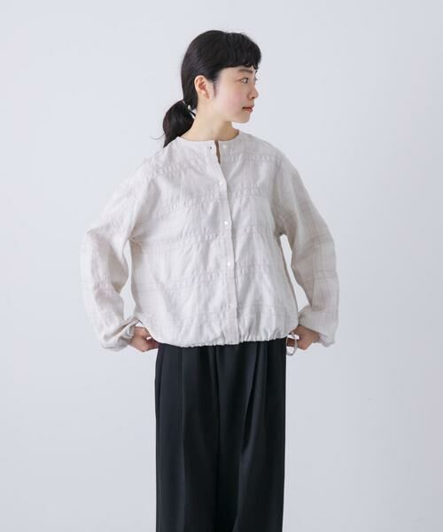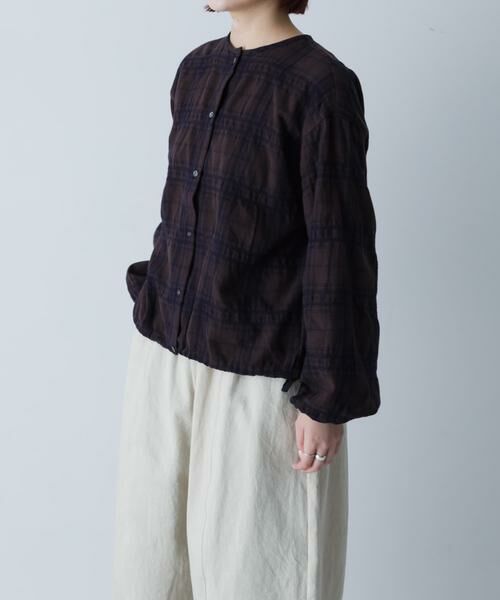 コットンの柔らかさとウールの温かみを掛け合わせた生地を使用しています。ワッシャー加工により凹凸が表現された風合い豊かな一品。落ち着いた色味のチェック柄なので派手になりすぎず程よい存在感を与えてくれます。クルーネックの前開きデザインは、トップスで着用するのはもちろんボタンを開けてカーディガンとしても活躍。後ろ襟ぐり・袖口にさり気なくギャザーが施されています。裾には紐が通してあり絞り具合が調節可能です。スタイリングに合わせたシルエットをぜひお楽しみください。