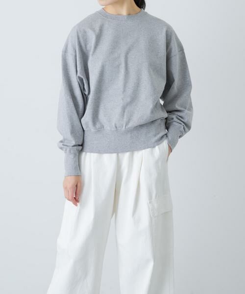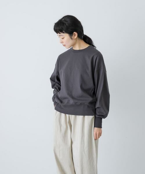 オープンエンドという空気の流れで撚りを加える方法で作られた糸を使用。軽い着心地なので春先にも重宝する素材感です。袖はルーズなサイジングですが着丈はややコンパクトなパターン。パンツ・スカートどちらにもバランスよく合わせられるようにしました。キュッと詰まった裾と袖口のリブがシルエットに奥行きを加えています。フライスで切り替えた脇のラインとフラットシーマのステッチがポイント。シンプルなデザインにさり気ないアクセントを取り入れた1枚。
