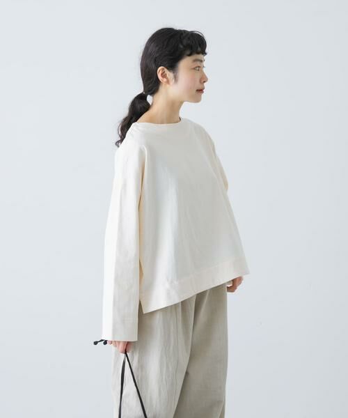 日々の着こなしに頼もしいトップスが届きました。太めの袖とボートネックが、カジュアルな中にこなれたムードを漂わせています。身幅はたっぷりとしていてリラックスした着心地。肩が落ちたデザインも抜けた雰囲気があります。パンツやスカートとの組み合わせはもちろんサロペットのインナーにも重宝。丈はさり気なく前後差があり、着た時のシルエットに抜け感を生みます。1枚あると何かと便利なおすすめアイテム。インナーにシャツを重ねるスタイリングも素敵ですよ。