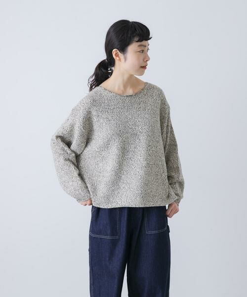 テープヤーンで編み立てたコットンニットが届きました。日々のコーデに取り入れやすくスタイリングに重宝するアイテム。季節を問わない風合いはロングシーズン活躍の予感です。衿ぐりはすっきりとしたボートネックを採用。女性らしい品の良さがあり、首元のシルエットを美しく演出します。程よくゆとりのあるシルエットがストレスフリーな着心地です。奥行きを感じるメランジのカラーも魅力的。同素材のベストもぜひご覧ください。