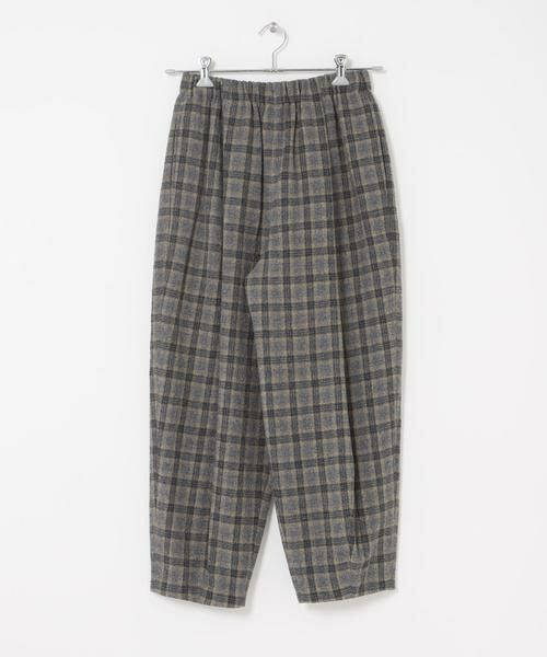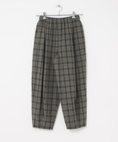 少しのクロップド感がポイントのイージーパンツ。落ち着いたトーンのチェック柄は、主張しすぎずシンプルなトップスと相性抜群です。ウエストのタックが立体感を生み奥行きのあるパターン。裾にはダーツが施され、テーパードしたデザインにこだわりを感じます。ウエストは総ゴムで楽な着心地なのも嬉しいです。両脇とヒップにポケット付き。