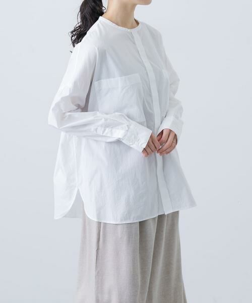 ロングシーズン着やすい綿素材で、羽織としても重宝するシャツをご用意しました。ワイドシルエットとコンパクトな首元が抜け感を演出。身幅はたっぷりとしていますが大きくは見えず、上半身のラインを拾わない絶妙なバランスに仕上げました。ボタンが見えない比翼仕様とヨークの無いすっきりとしたデザインがミニマルな雰囲気に。日常にもお仕事にもシーンを問わず活躍する優秀な一品。これからのシーズンはベストやカーディガンを重ねたり、インナーにタートルネックを合わせる着こなしがおすすめです。