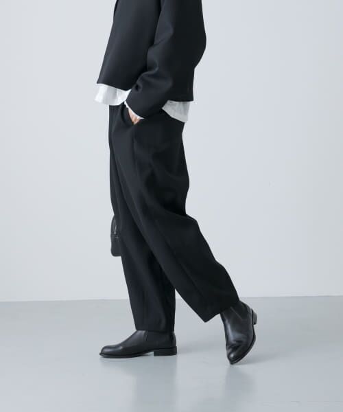 オケージョンシーンに寄り添うアイテムが届きました。ほんのり丸みのあるコクーンデザインが女性らしく優しげな印象。フロントのタックが奥行きを生み、落ち感のある素材と相まってどこかスッキリとしています。裾に向かった程よくテーパードがかかっているので、トップスとのバランスが取りやすいです。生地はスーツなどに使われるクリアな表面のウール100%素材。ウエストはゴムで楽な着心地なのに、抜け感のあるシルエットがぐっとお洒落な雰囲気に。同素材のジャケットを合わせれば、かぐれらしさ溢れるセットアップコーデが完成です。