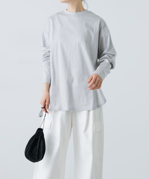 1枚持っていると日々のコーディネートに頼もしいトップス。着こなしのメインとしてはもちろん、スウェットやベストと重ねた時に、襟ぐりや裾がちょうど良くのぞくバランス感にこだわりました。コンパクトな首まわりや、シルエットを拾いにくい程よいゆとり、どこか品のある素材感など大人好みな仕立てになっています。ボトムはスカート・パンツ問わず好相性でサロペットに合わせるのもおすすめ。ジャケットやカーディガンのインナーにも重宝し、様々な場面で大活躍のアイテムです。