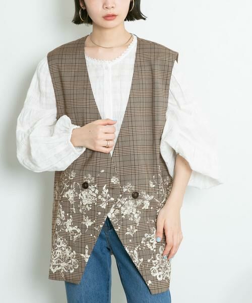 ハンサムな雰囲気をもつチェック柄のベストに、ヴィンテージライクなレースプリントを施した他には無い1着。Vネック仕様や腰回りが隠れる程良いサイズ感はカジュアルなアイテムとも合わせやすくて◎いつものコーデに羽織るだけでワンランク上のスタイリングが完成します。