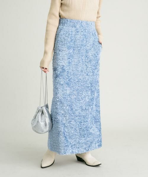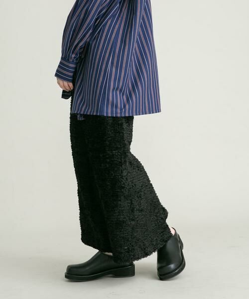 トレンドのミニフリンジ生地を使用したタイトスカート。生地にボリュームがある分、シルエットをすっきりとさせバランスを取りました。後ろゴム仕様で着脱しやすいのも嬉しいポイント。存在感がありながらも合わせやすいBLACKと、暗くなりがちな秋冬コーデに映えるBLUEをご用意しました。