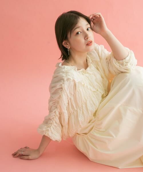 ギャザーをたっぷり使用したデザインが魅力の大人可愛いブラウスが登場。一見普通のブラウスに見えますが、前後上下着用可能な優れもの。上下回転させるとオフショルダーにも変化!合わせるアイテム次第でロングスパンの着こなしが期待できます◎フェミニンな印象のOFF&ORANGE、シックなBLACKの3色展開です。