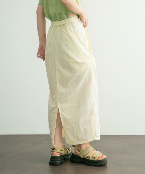 程良いハリのある素材を使用し、ポケット下のタックがボリューム感を醸し出すデザインスカート。すっきり見えするシルエット、抜け感を演出するバックスリット仕様にも注目。軽い穿き心地なので夏に嬉しい1着です。