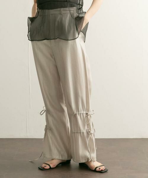 リボンディテールとシャイニー素材が存在感を放つパンツ。後ろゴム仕様で着脱しやすく、裾は絞ることができるので自由にシルエットの変化を楽しめます。シンプルな着こなしにプラスするだけで、トレンド感のあるスタイリングが叶います。