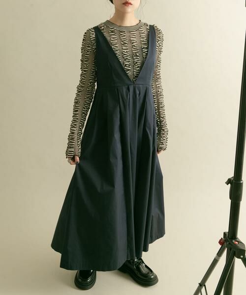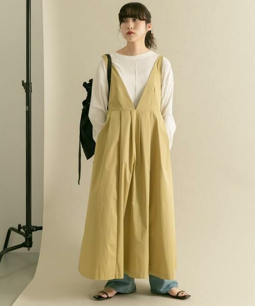 ボリュームたっぷりなスカートなので、トップスはコンパクトなアイテムを合わせるとバランス良く仕上がります。ジャンパースカートとして着ていただくのはもちろん、デニムをレイヤードしカジュアルさをプラスした着こなしも◎