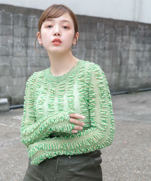 シャーリングディテールのくしゅくしゅ感が可愛い着映えトップス。インパクトのある柄ながらも程良い透け感があり、ランダムな凹凸仕様が軽やかな印象にしてくれます。コンパクトな着丈はメインのみならず、インナー使いにもおすすめです。