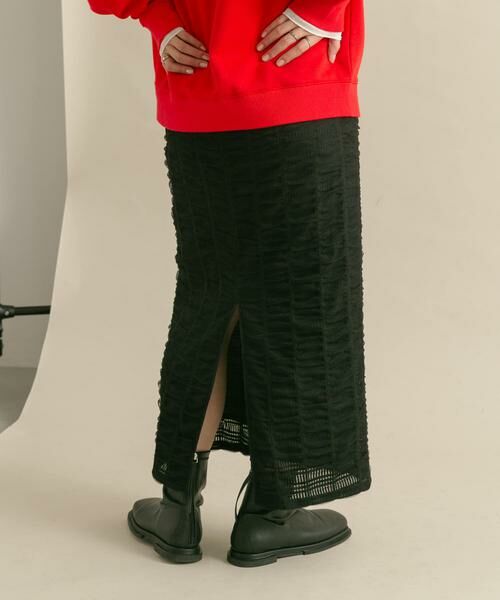 メッシュ生地の上からチュールをたたきつけた、表面感のある素材が特徴的な大人フェミニンスタイルにぴったりなスカート。足捌きが良くなるバックスリット仕様も◎Iラインシルエットは自然とスタイルアップが叶い、どんなトップスとも相性良く着ていただけます。