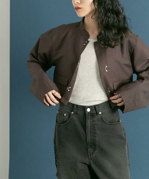 フロントホックデザインとスタンドカラーデザインがモードな印象を放つジャケット。程良くゆとりのあるサイズ感ながらも、ショート丈仕様なのですっきりと纏まります。両サイドに施されたポケットもさりげないポイントです。メイン使いはもちろん、コートの中にも着ていただけます。