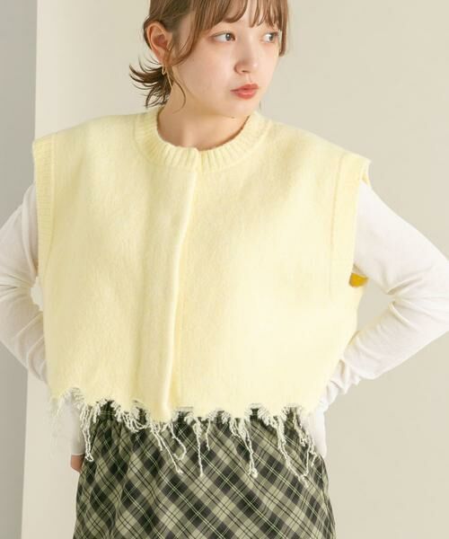 ニットベストをばっさりカットしたようなダメージ加工が目を惹くベスト。程良く厚みのあるもちっとした編地はきれいなシルエットを保ちます。コンパクトなショート丈なので、ボリュームのあるボトムと穿くとバランス良く仕上がります。秋冬のレイヤードスタイルにぜひ。